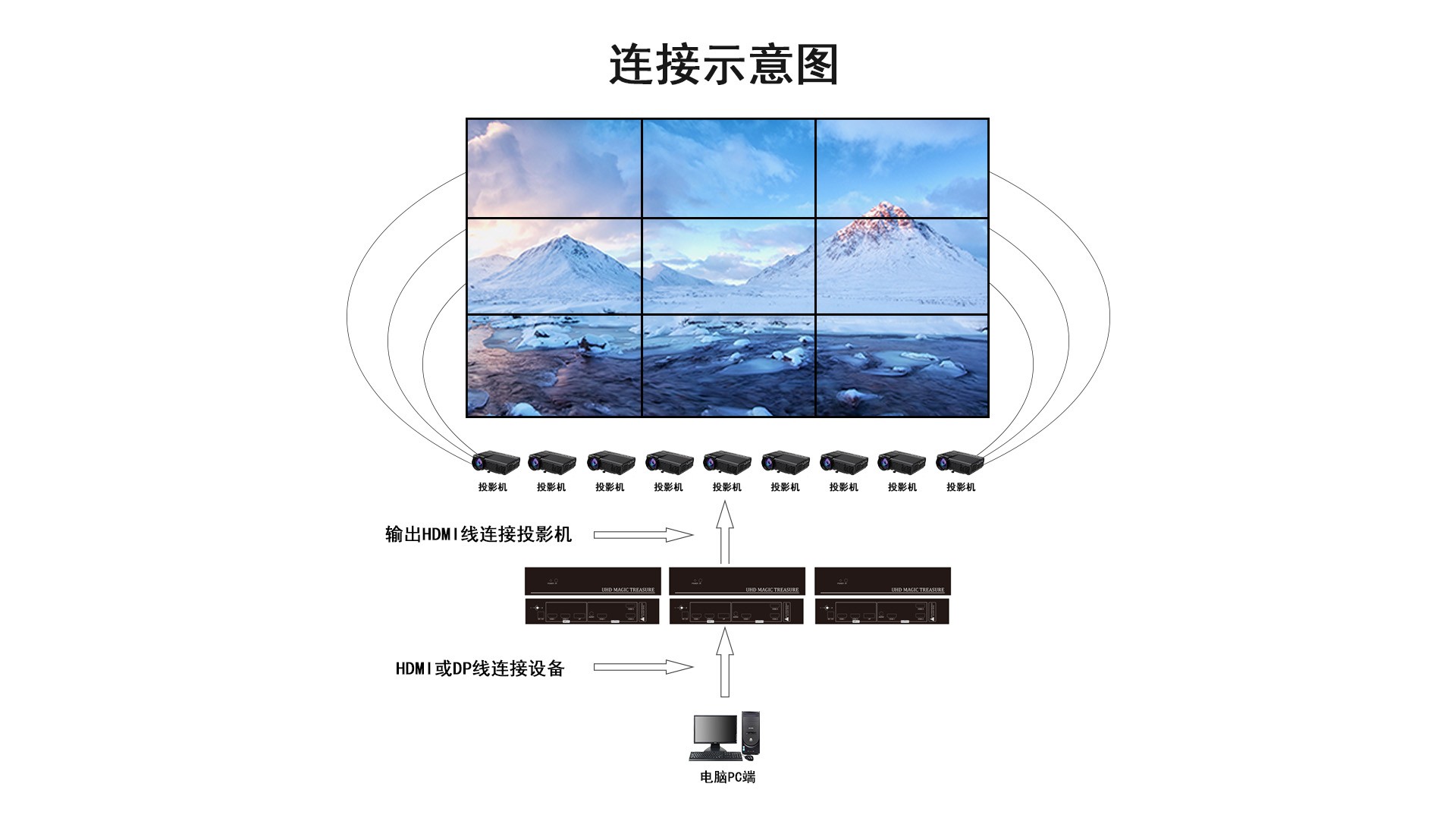 多屏宝也称多屏扩展仪、多屏显示处理器等,其作用是实现一机多屏显示,即一台主机将内容显示到多台显示器上,根据同的需求可以将不同的画面显示到不同的显示屏上,是一种实现多屏显示效果的高性价比方式。