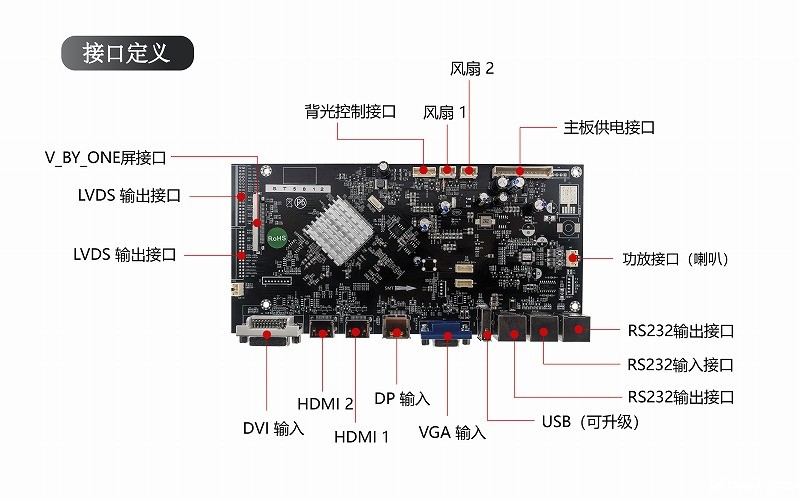 本驱动板能更好解调出各种输入信号,内含强大的视频处理功能,能输出高质量的画面。提供VGA, DP,DVI,HDMI等接口,支持1080P(VGA,DVI信号)以内的输入,支持3840×2160@60HZ(HDMI,DP信号)以内高清信号输入,直接驱动全系列的大尺寸4K VBY1 60HZ液晶屏(26寸以上),效果更好并提供逐行的高清晰的视频,可实现任意通道15x15(极清信号支持到10x10拼接)内拼接,该板卡还集成了温控、时钟、LED指示灯。