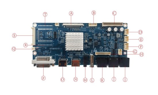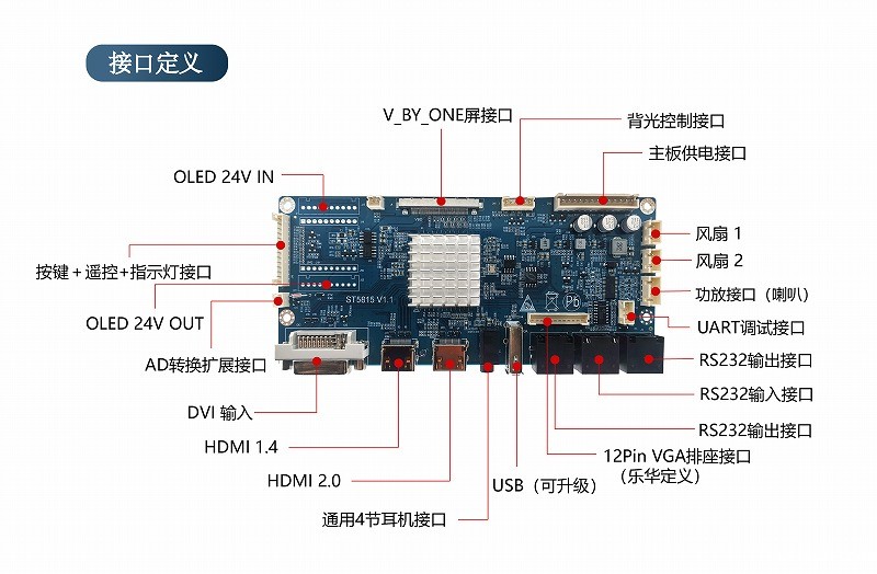 ST5815是一款全面高性能的拼接屏显示驱动板。内含强大的视频处理功能,能输出高质量的画面。提供VGA(内接)。HDMI,DVI等接口,支持1080P(VGA信号)以内的输入,支持3840×2160@60HZ(HDMI信号)以内高清信号输入,支持4K60 V_BY_ONE输出,支持OLED屏幕超时保护(选配),效果更好并提供逐行的高清晰的视频,支持高品质功放及耳机的音频输出。该板卡还集成了温控、LED指示灯、按键、遥控,光控等便捷功能。