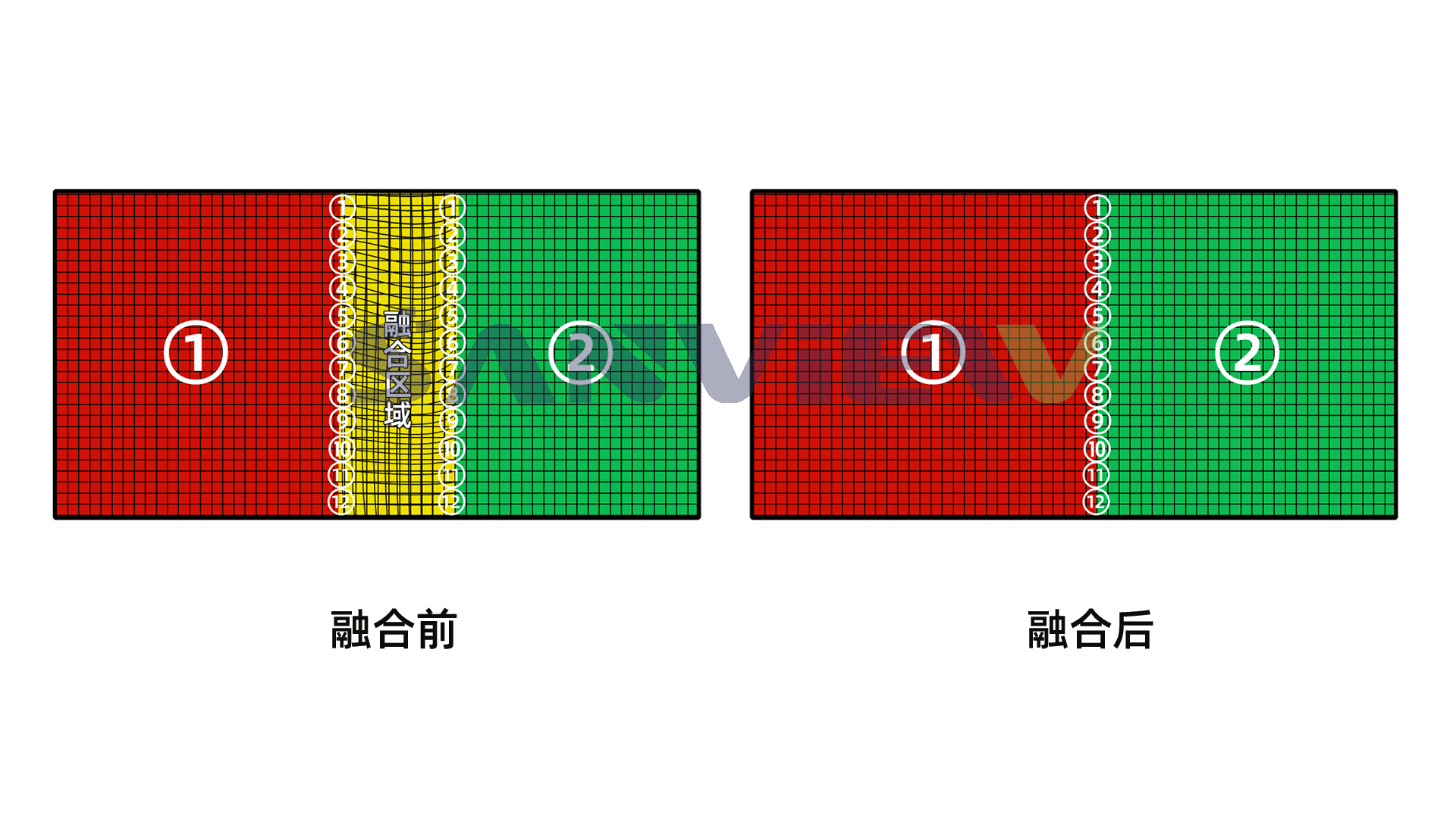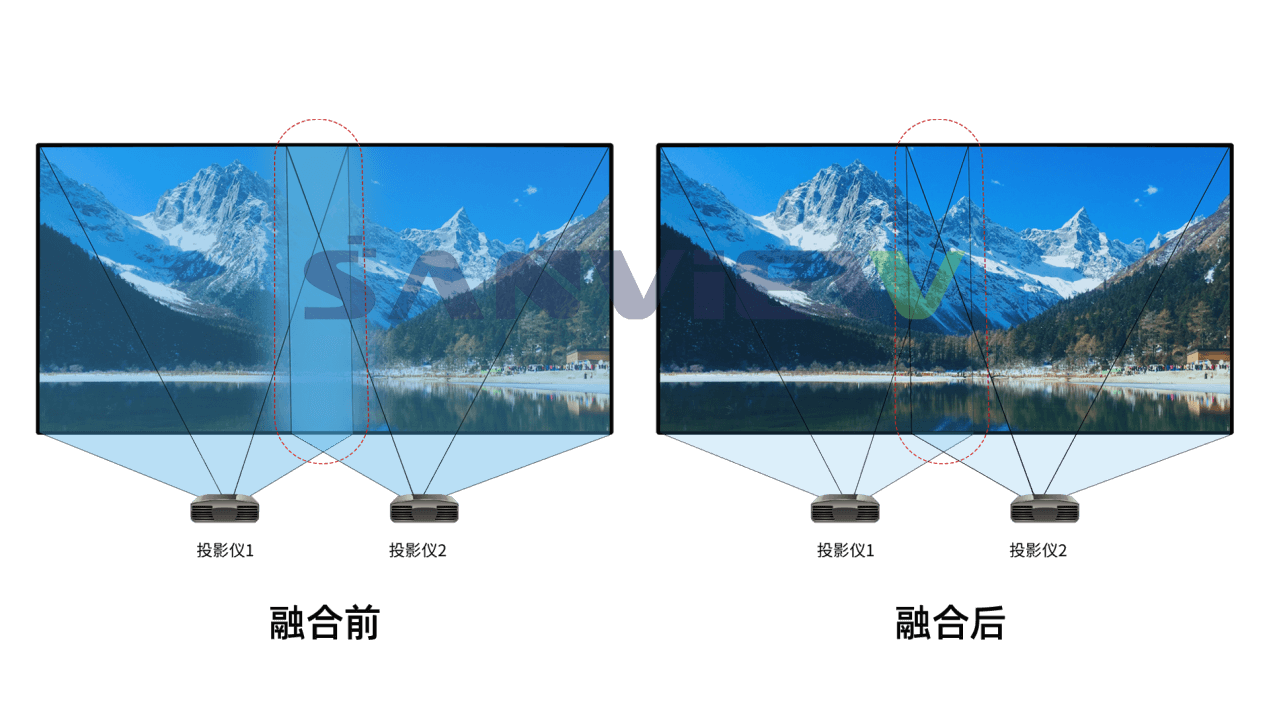 当两台或多台投影机组合投射一幅画面时,会有一部分影象重叠,这时就需要利用投影融合技术(网格式几何校正技术)将多台投影机投射出的画面进行边缘重叠,重叠部分亮度调低,使整幅画面的亮度一致,从而显示出一个完整、没有缝隙的画面,其效果就像是一台投影机投射的画面。