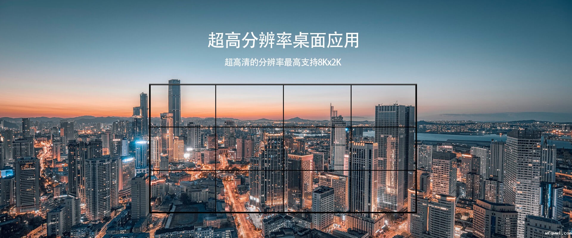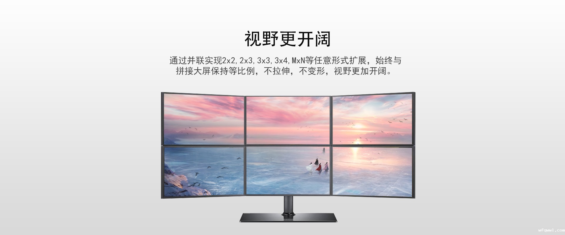 5. 最大支持1进4出,可轻松实现横向、纵向拼接及垂直拼接分割,并支持通过并联方式实现更大规模的1xN,Nx1,MxN以及旋转90°等比拼接显示,不拉伸,不变形;