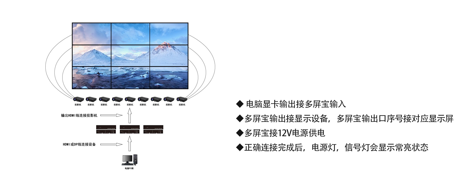 多屏宝也称多屏扩展仪、多屏显示处理器等,其作用是实现一机多屏显示,即一台主机将内容显示到多台显示器上,根据同的需求可以将不同的画面显示到不同的显示屏上,是一种实现多屏显示效果的高性价比方式。