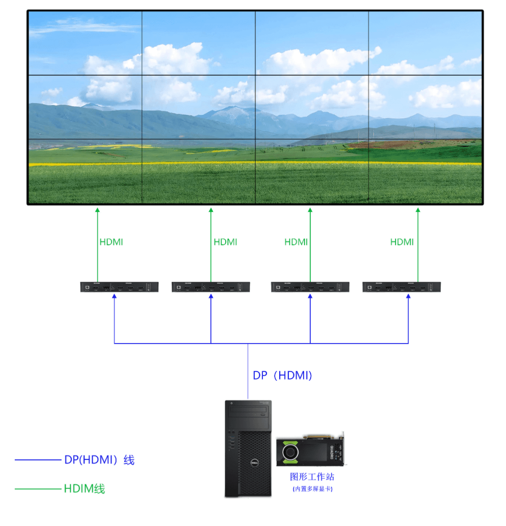 多个多屏宝和NVIDA、AMD等专业图形卡通过级联的方式可实现2×3、3×3、3×4、4×5、M×N等任意形式扩展,始终与拼接大屏保持等比例,画面无压缩,视野更加开阔,可应用于大型广告墙、调度中心、展览展示、会议活动、游戏竞技大屏等场合。