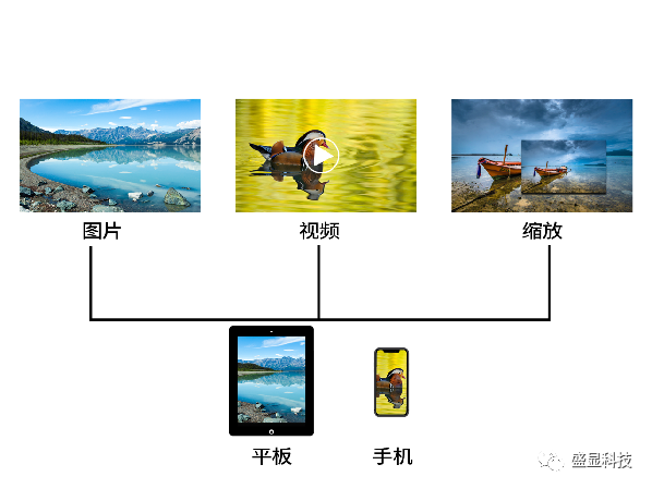 支持通过各种平板电脑、手机等移动终端实现对各种信号及信息进行切换、漫游和缩放操作,以及场景切换调用;也可实现将平板电脑或手机上的视频或图片上传,并将所上传的视频或图片上屏显示。