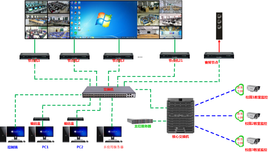 本项目建设的一个重要目的就是实现教室的音视频监控,能够把老师讲课时教室的视频画面和老师讲课的语音同时传递到本调度中心,以对老师讲课效果进行整体评估。