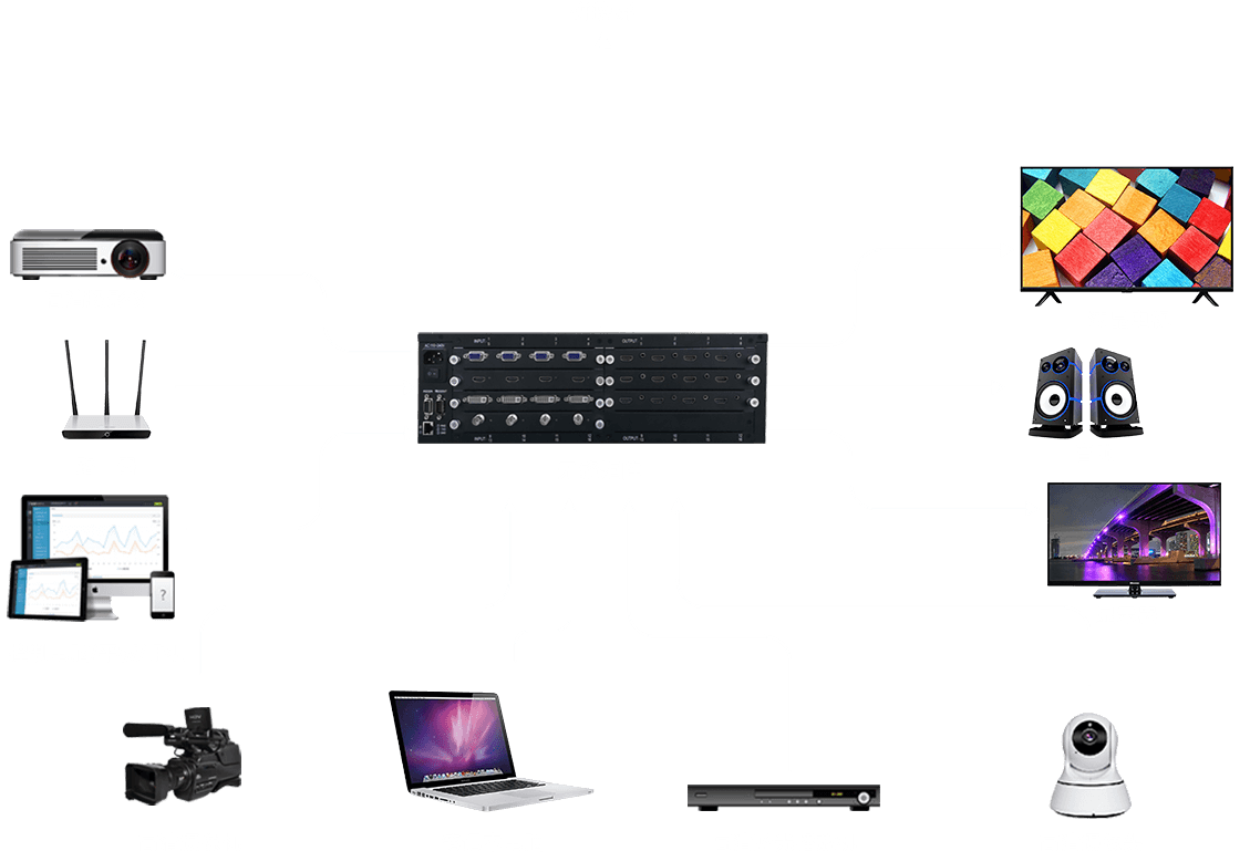 音频、视频信号互联互通,实现多房间、多场地间信号的共享与切换。