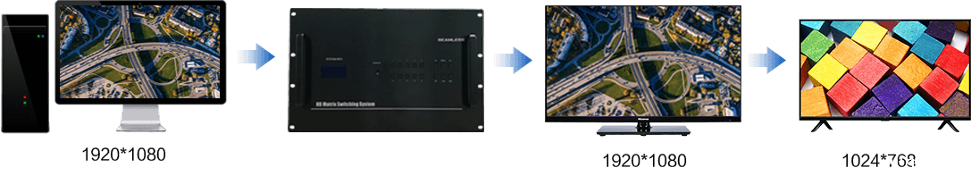 每个输出通道可以配置相同或不同的分辨率,高低分辨率间可正常切换,以便在使用不同显示屏幕切换不同分辨率信号时可达到更优质的显示效果。