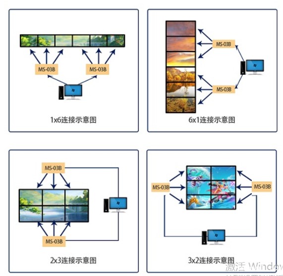 5. 最大支持1进4出,可轻松实现横向、纵向拼接及垂直拼接分割,并支持通过并联方式实现更大规模的1xN,Nx1,MxN以及旋转90°等比拼接显示,不拉伸,不变形;