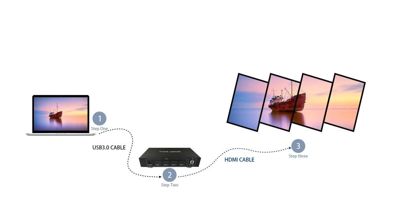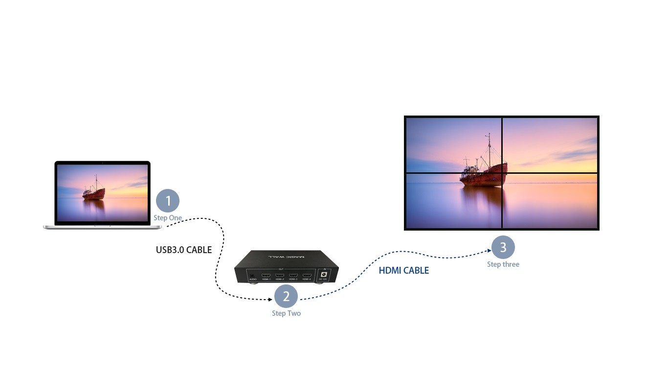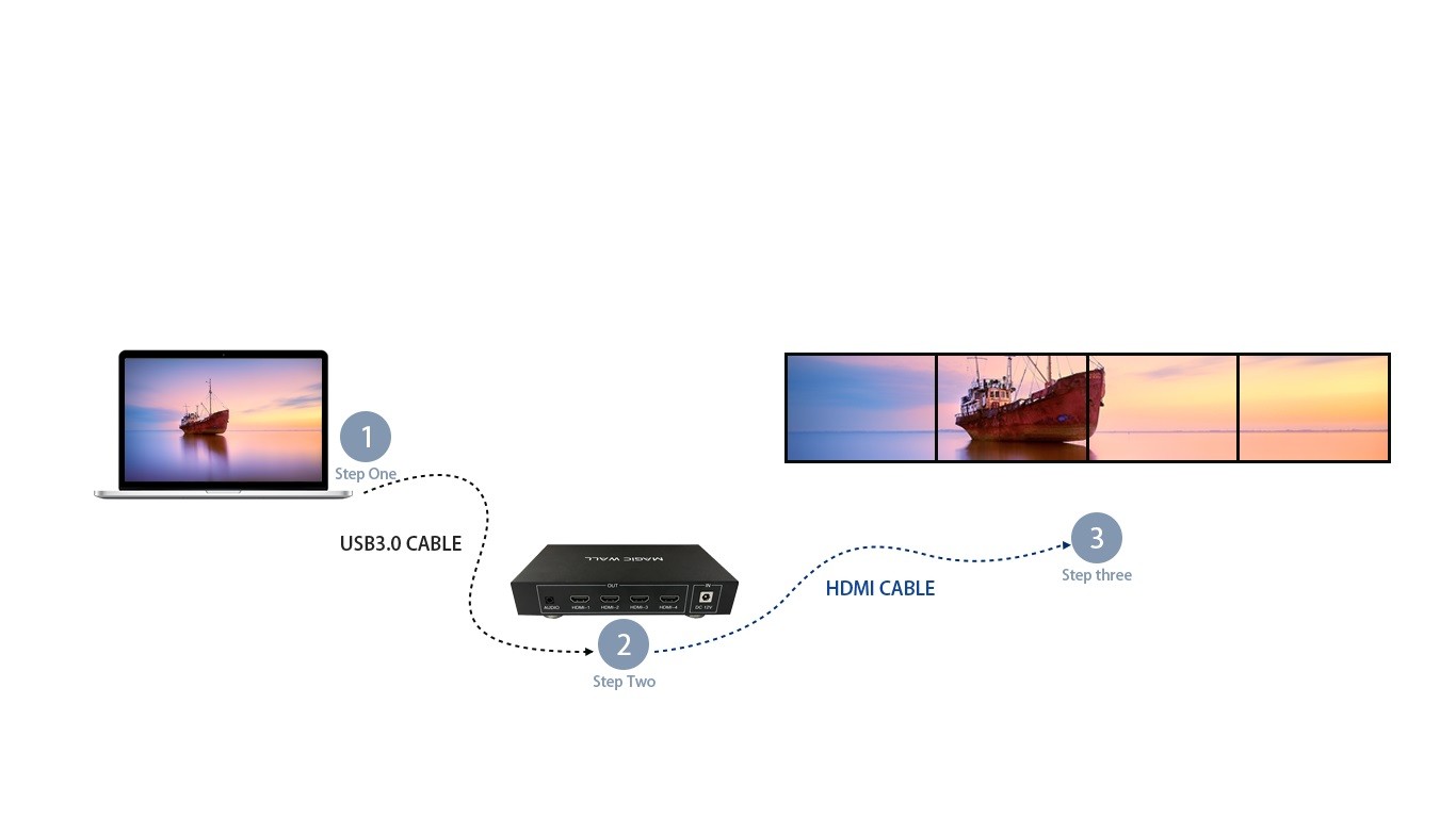 本产品是一款专门针对液晶电视、超窄边液晶屏、投影机的高清画面拼接处理器。HDMI 信号输出,连接液晶电视机或其它显示设备,每个输出口的分辨率达到1920*1080@60Hz。电脑配合此设备可以实现1*N、N*1、M*N以及90度旋转等比拼接显示,不变性,不拉伸,也可以实现 0 – 360度得任意旋转拼接实现艺术墙效果。可广泛应用于超高分辨率桌面应用、超大屏幕墙、指挥调度系统、多屏幕视频监控、工程显示应用,多通道投影、虚拟现实、环幕影院、大型广告墙、LCD/LED拼接屏等。
