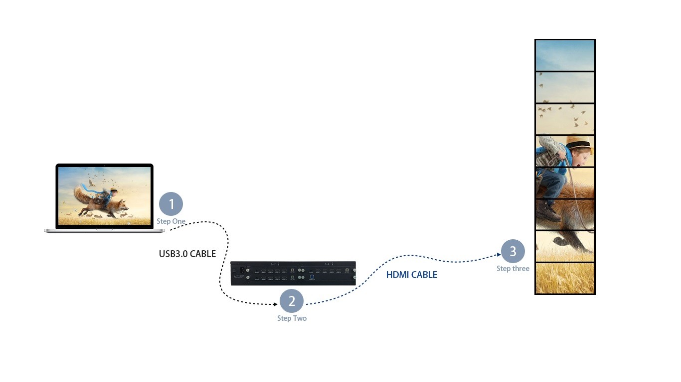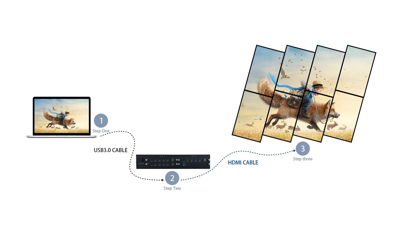 本产品是一款专门针对液晶电视、超窄边液晶屏、投影机的高清画面拼接处理器。HDMI 信号输出,连接液晶电视机或其它显示设备,每个输出口的分辨率达到1920*1080@60Hz。电脑配合此设备可以实现1*N、N*1、M*N以及90度旋转等比拼接显示,不变性,不拉伸,也可以实现 0 – 360度得任意旋转拼接实现艺术墙效果。可广泛应用于超高分辨率桌面应用、超大屏幕墙、指挥调度系统、多屏幕视频监控、工程显示应用,多通道投影、虚拟现实、环幕影院、大型广告墙、LCD/LED拼接屏等。
